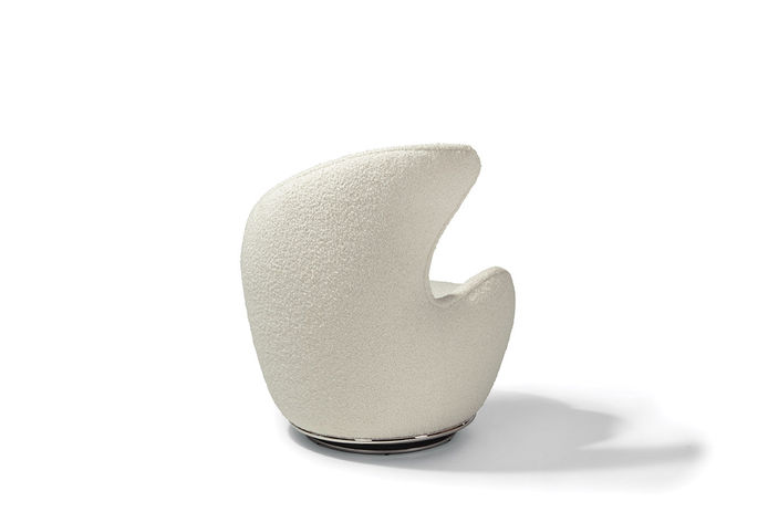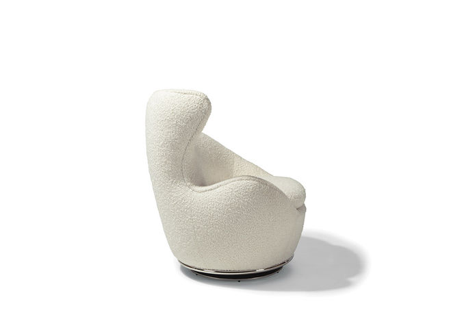 This high back swivel chair is signified by its uniquely asymetrical shape. Each chair is a star on its own, but ideally to be showcases in a pair to mirror each other's sculptural organic form. The silent smoothness of the mechism's swivel emmulates perpetual motion.